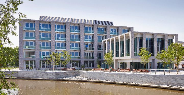 Een mooi voorbeeld daarvan zijn de technische installaties op het dak van het gebouw, die weggewerkt zitten achter een ventilerende lamellenwand. Om inkijk vanaf de begane grond te voorkomen, werden die Linius-lamellen (L.120) van leverancier Renson omgekeerd gemonteerd.