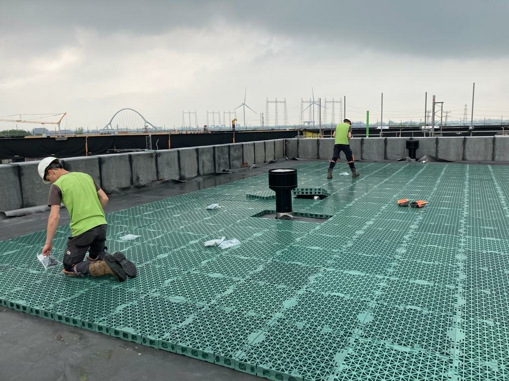 Het dak van dit appartementenblok beslaat in totaal ongeveer 700 m² en wordt uitgerust met RSX 65 en RS 60 retentie-elementen en ZinCo Meteo Active. De RSX 65 is bestand tegen zware belastingen, in dit geval bedoeld om de belasting van de pv-panelen te dragen. RS 60 is geplaatst onder groenstroken. De retentie-elementen hebben een gemiddeld waterbergend vermogen van 60 L/m² en helpen daardoor de riolering ontlasten en regenwater duurzaam her te gebruiken voor irrigatie van beplanting en in de binnentuin op de parkeerkelder.