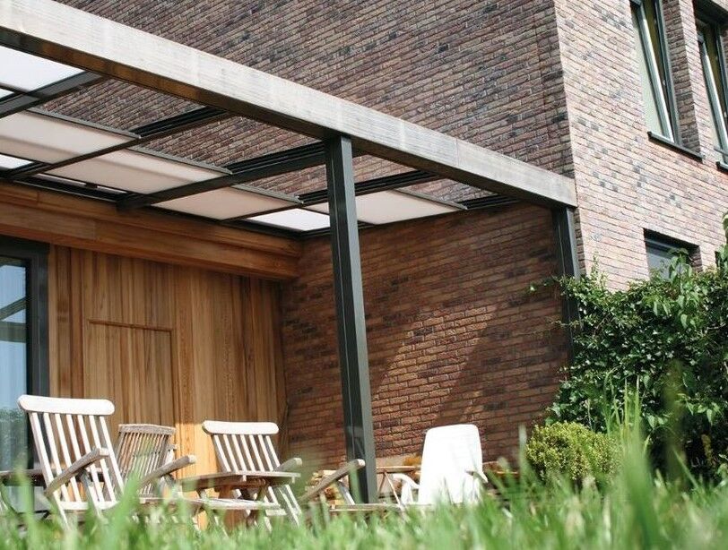 Er is uiteindelijk gekozen voor een polycarbonaat opaal zonwerend (vandaar de melkkleur), wat zorgt voor een vertraging van de warmte. Hierdoor is er geen zonwering nodig en is de investering 2 in 1. De huizen hebben allemaal dezelfde look: rode bakstenen en houten deuren. De goot is speciaal aangepast met houtlook, zodat het perfect aansluit bij de woning maar evengoed onderhoudsvrij aluminium is. Dit geeft een heel gaaf effect. De systemen van Ittalum zijn zo ontworpen dat er altijd (later) nog besloten kan worden om er een wand onder te plaatsen, wil de klant er alsnog een afgesloten ruimte van willen maken.