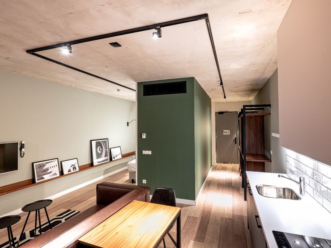 Via de Technische Unie leverden wij bijna alle verlichting voor het indrukwekkende hotel. Accountmanager Leo van Aken: “Binnen het nieuwe appartementencomplex heeft Elektroservice Holland BV uit Hardinxveld-Giessendam ons 3 Fase Eurorail-systeem met bijbehorende ledspots gebruikt. Nadat we de functionaliteiten en belevingswaarde van dit systeem vooraf in een speciaal gecreëerde demo kamer uitvoerig aan de klant hebben gedemonstreerd, zijn de in zwart uitgevoerde armaturen vervolgens tegen de betonnen plafonds van de appartementen gemonteerd. Een perfecte combinatie."