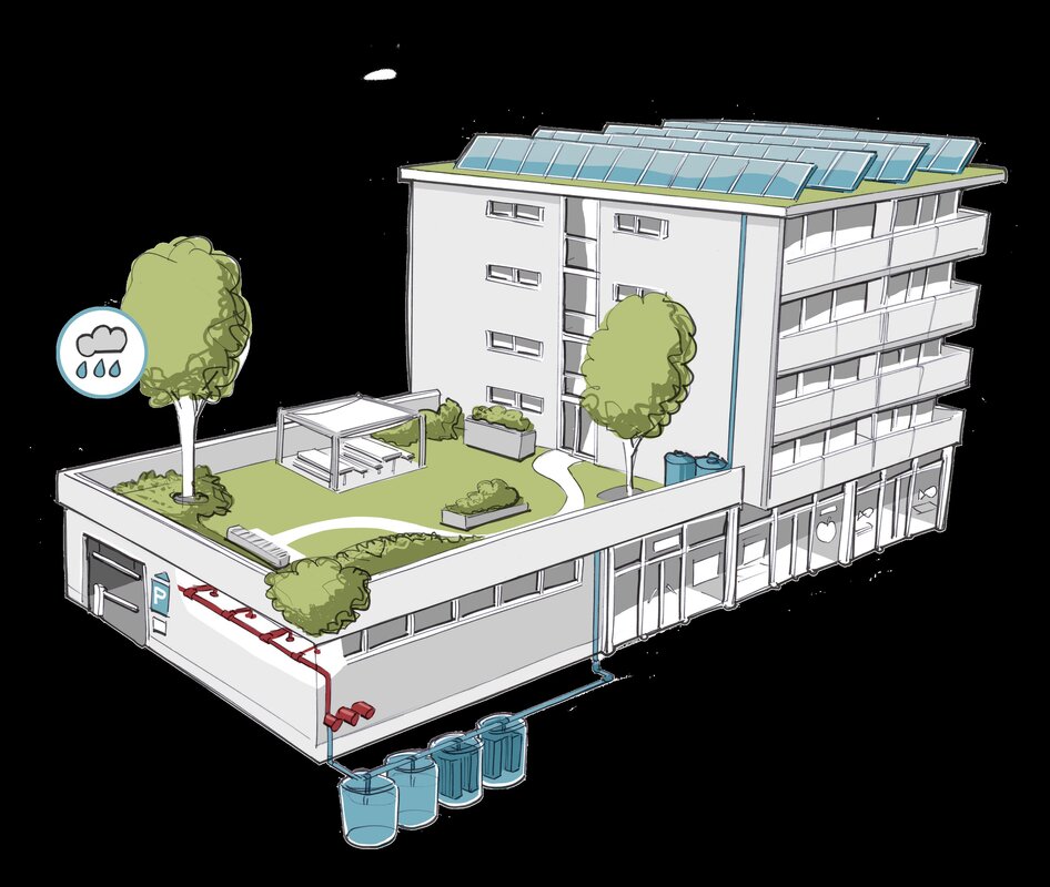REGENERGIE biedt een complete oplossing voor regenwaterbeheer op percelen. Het ontlast de riolering tijdens piekbuien, beperkt droogteproblemen, reduceert hittestress, verwarmt gebouwen met warmtewinning uit regenwater en optimaliseert watergebruik voor sprinklersystemen. Door innovatieve regenwateroplossingen te implementeren, dragen we bij aan een duurzame toekomst waarin efficiënt waterbeheer centraal staat.
