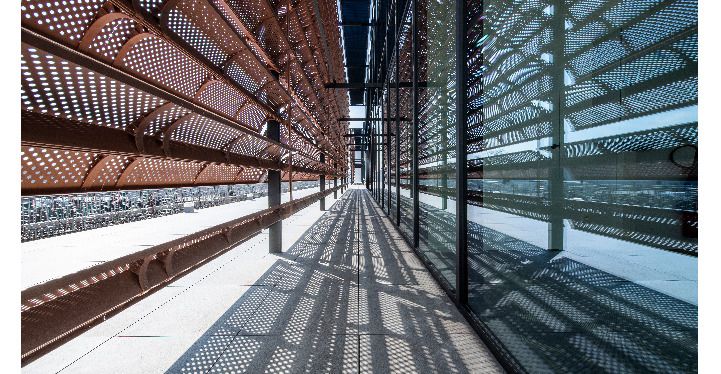 ‘De DucoSun Wing is geperforeerd en zorgt zo voor een perfecte harmonie tussen zonwering en beschaduwing’, vertelt Pieter Decat, technisch-commercieel adviseur. ‘De stand van de lamellen kan vrijwel traploos geregeld worden, zodat op de werkvloer, hoe de zon ook naar binnen schijnt, er geen last is van hinderlijke lichtinval. De structurele zonwering bij DCM zorgt niet alleen voor een efficiënte afscherming van de zonnestralen, ze garandeert ook een daling van de gemiddelde temperatuur binnenshuis tot 12% in de strijd tegen oververhitting.’