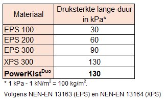 Net zoals de eerdere PowerKist is de PowerKistDuo ook een 3-delige bekisting met losse bodemplaten en zijwanden. De combinatie van XPS en de extra drukvaste EPS in de bodemplaat geeft de kist haar ongeëvenaarde hoge lange-duur druksterkte van maar liefst 130 kPa. Deze hoge druksterkte vergroot de toepassingsmogelijkheden van deze kist en/of kan de benodigde breedte van de betonmaat mogelijk verkleinen.