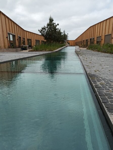 Een opmerkelijk architectonisch element is de aanwezigheid van een glasdak boven het atrium, waarover water stroomt, dat het gevoel van een meanderend beekje creëert. Of zoals de architecten het omschrijven: een dakstrand.