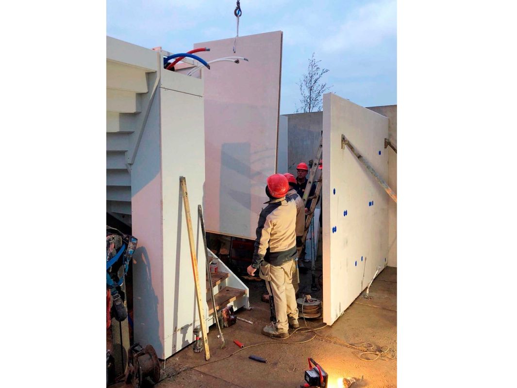 ‘De markt was op zoek naar een vervanger van de natte afbouw. Bij deze traditionele bouwwijze zijn wel vier of vijf disciplines nodig. Loopt het bij discipline één wat uit, dan hebben de partijen die daarna komen direct een probleem,’ vangt Monique de Vos-Faay aan. ‘Die verschillende handelingen in de natte afbouw werken vertragend. Daar heeft FAAY, als onderdeel van een speciale ontwikkelgroep, een oplossing voor: kingsize wandpanelen. Deze complete binnenwanden zijn binnen een paar uur geplaatst en de elektra… die zit er al in!’