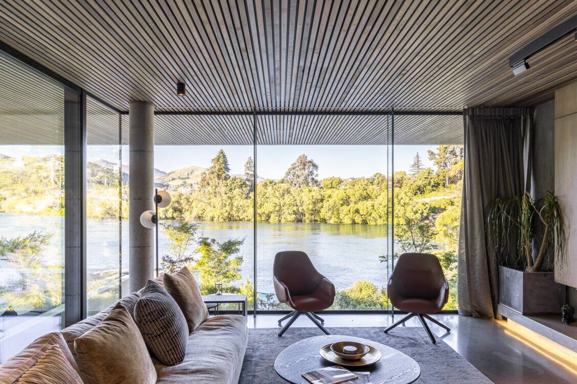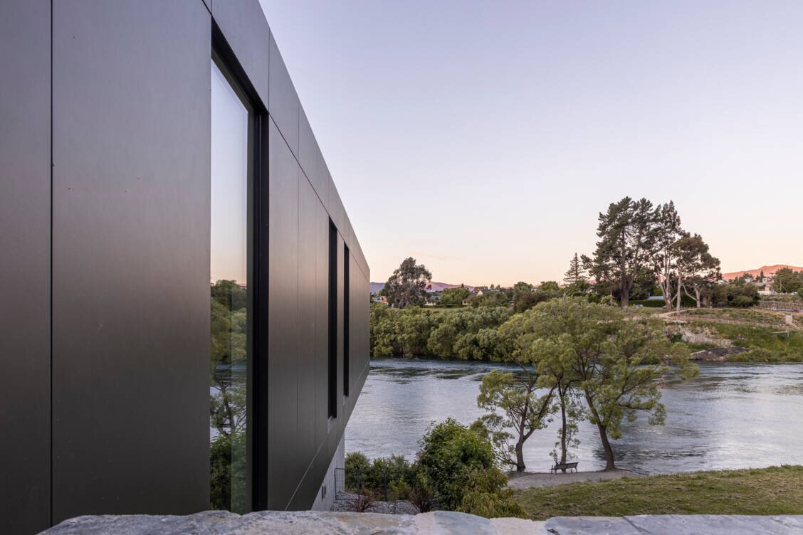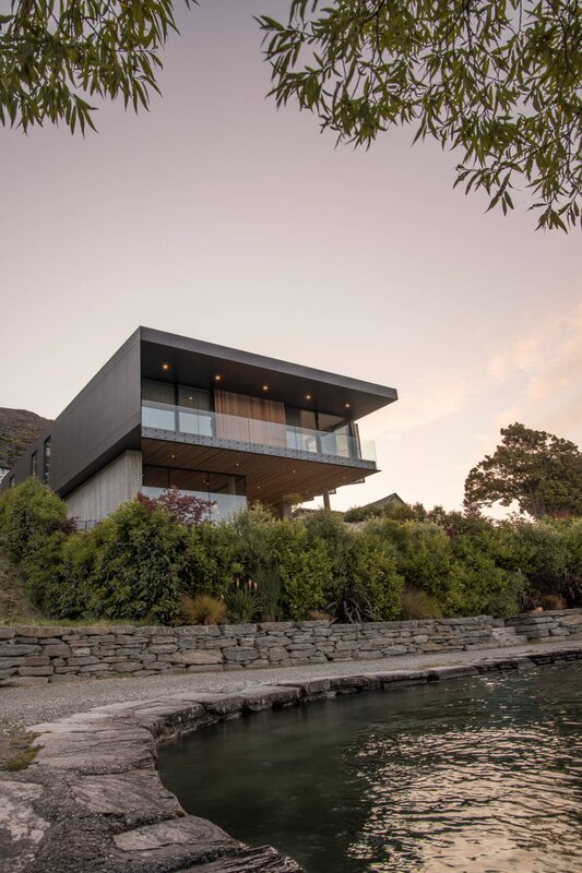 Het Lakes Edge House ligt op een smalle, hellende locatie boven het Wakatipu-meer in Queenstown in Nieuw-Zeeland en biedt een prachtig uitzicht op het meer en het omringende berglandschap. Het huis lijkt met zijn met hout beklede ondergedeelte en met donkere Swisspearl bedekte bovenverdieping precair boven het terrein te zweven.