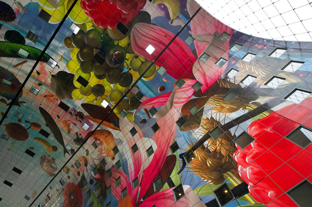 Wie de Markthal in Rotterdam binnenloopt kan zijn ogen niet afhouden van het overweldigend mooie plafond. Het is alsof je een hedendaagse Sixtijnse kapel binnenloopt.