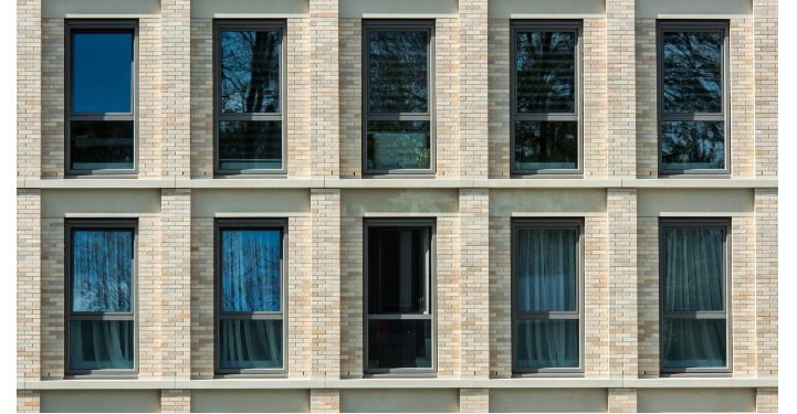 De gevel is opgetrokken in een combinatie van gevelsteen en architectonisch beton. Opvallend zijn de bijzondere detaillering en de subtiel ingewerkte ventilatieroosters boven de ramen. ‘Vanuit de Nederlandse markt hadden we een tijdje geleden een concrete vraag gekregen naar een specifieke oplossing voor de montage tegen stelkozijnen’, verduidelijkt Roel Berlaen, communicatieverantwoordelijke bij Renson. ‘Om dat te kunnen realiseren, hebben we van onze raamventilatie Invisivent een aparte variant voor die markt gecreëerd. Aanvankelijk was dat een maatwerkoplossing voor deze Leo Vromantoren, maar inmiddels heeft dat geleid tot een standaard systeem dat we vanaf dit jaar verder in Nederland introduceren.’