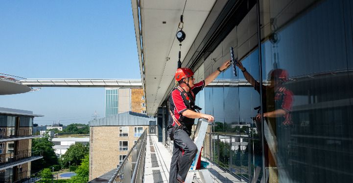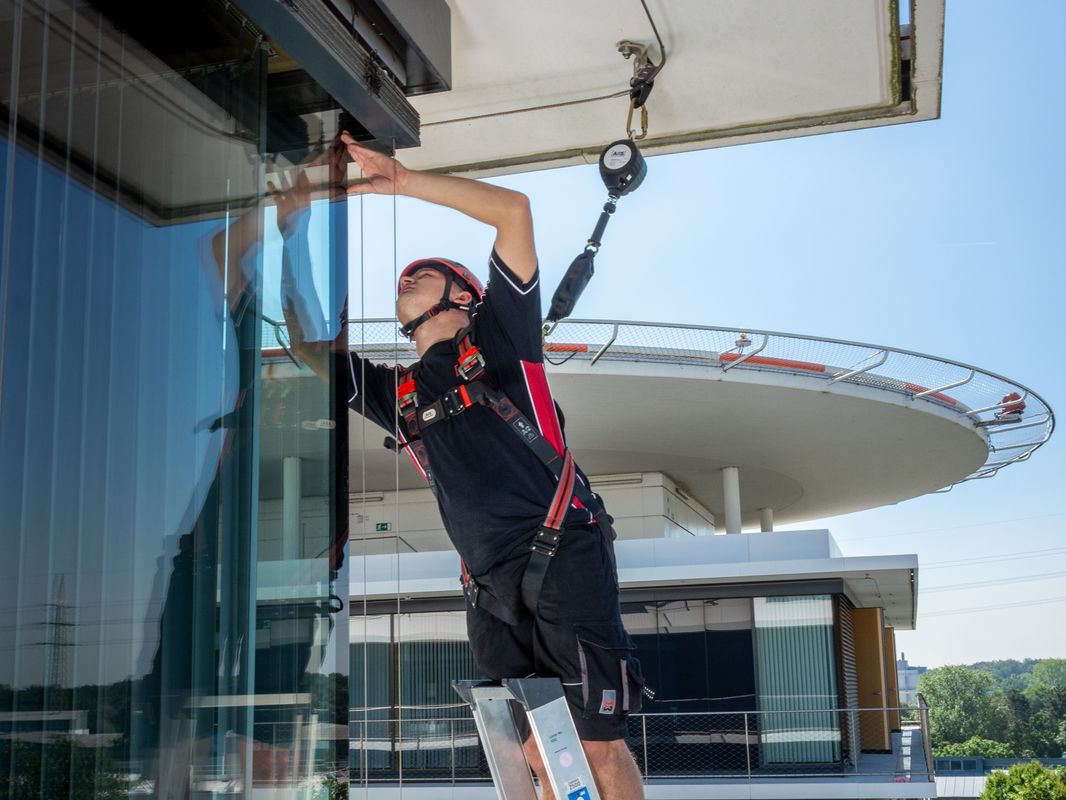 Er moet veel vaker aan de buitenkant van het gebouw worden gewerkt dan u denkt. Vooral het reinigen van ramen wordt op veel locaties regelmatig uitgevoerd. De locaties zijn echter niet altijd veilig te bereiken - hier wordt vaak persoonlijke beschermingsmiddelen tegen vallen (PBM’s) gebruikt, d.w.z. veiligheidsharnassen en werklijnen waarmee werknemers veilig kunnen worden aangelijnd. Voor deze zogenaamde touwbescherming is meestal een ter plaatse geïnstalleerde veiligheidsvoorziening vereist, waaraan de PBM’s betrouwbaar kunnen worden bevestigd. De eigenaar van het gebouw is in het algemeen verantwoordelijk voor de aanwezigheid en correct functioneren van de permanent geïnstalleerde veiligheidsmaatregelen