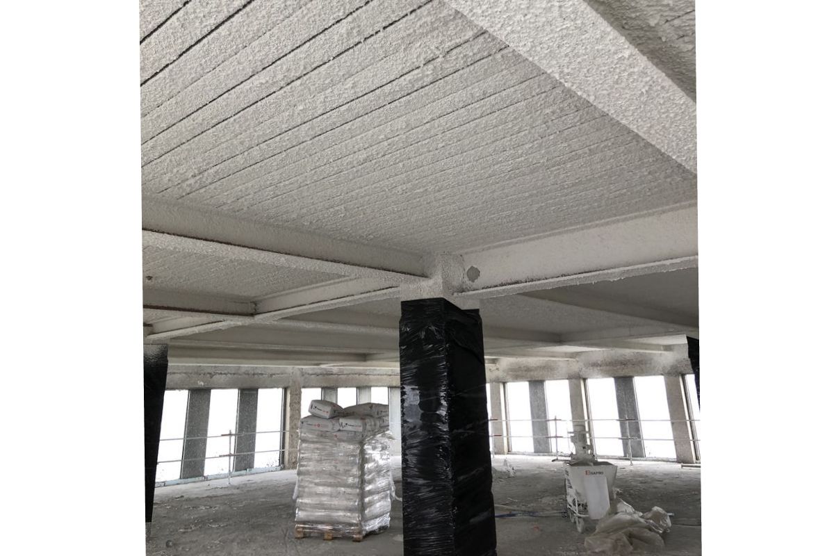 Zo levert REPPEL tegenwoordig de PROTHERM LIGHT. Dit is een lichtgewicht brandwerende spuitmortel op basis van witte EPS-korrels, cement en speciale additieven.