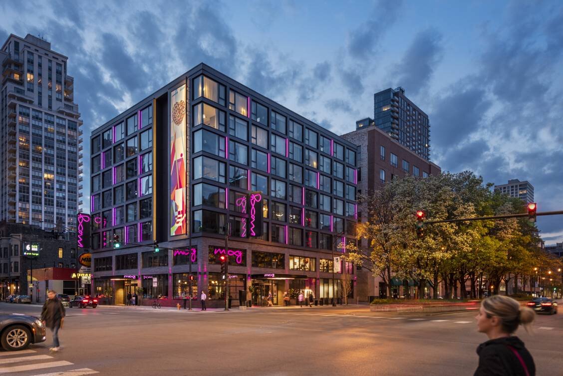 Het gebouw van het Moxy Hotel in Chicago staat met zijn benen op de grond als een vriendelijk, levendig en tegelijkertijd transparant onderdeel van de energieke buurt