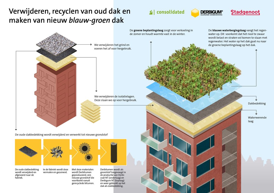 Bij de aanleg van een nieuw blauw-groen dak bij sociale huurwoningen aan het J.F. Berghoefplantsoen in Amsterdam gaan dakspecialist Consolidated en leverancier Derbigum in samenwerking met woningcorporatie Stadgenoot de oude dakbanen recyclen en verwerken tot een nieuwe grondstof, Derbitumen. Deze grondstof wordt ingezet bij nieuwe duurzame en circulaire dakbedekking. Het is voor het eerst in Nederland dat dit op deze manier gebeurt.