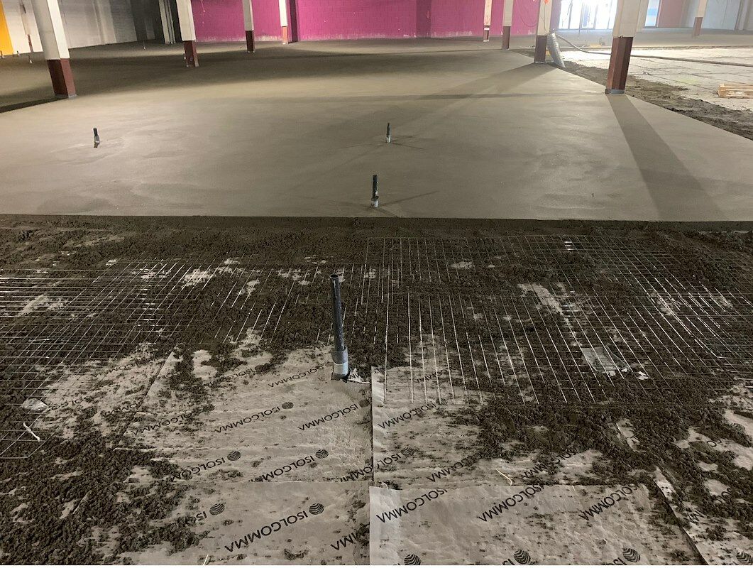 Hierna kwam de uitvraag van NK Bouwbegeleiding aan ISMT. Hierin werd o.a. gevraagd naar een drukvaste isolatie (nuttige belasting van 1000 kg/m2), die voldoet aan de contactgeluidisolatie eis van Ln,TA van 29 dB. Deze eis is gesteld omdat er boven de supermarkt appartementen zijn gesitueerd. Bovenop de isolatie zal een zandcement dekvloer worden aangebracht van 50-70 mm (kwaliteit≥ C20) door vloerenbedrijf F.H.L. van Berkel, afgewerkt met een keramische vloertegel door Imarco.