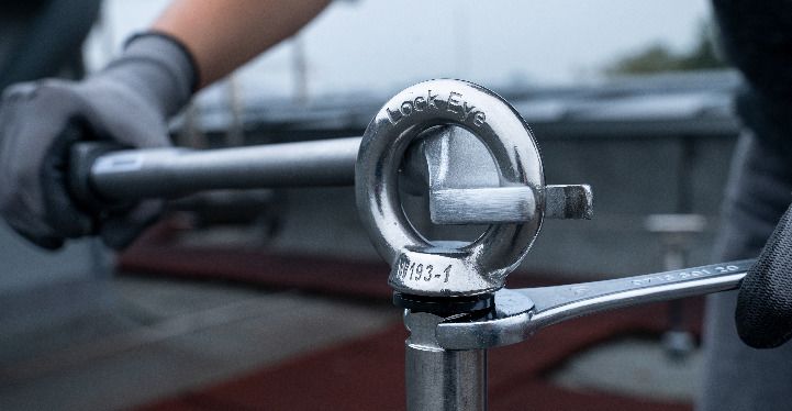 De montage van de ABS-Lock II-BE Pro 24 is zeer eenvoudig: eerst wordt er een gat geboord, daarna wordt deze schoongemaakt en wordt het RVS ankerpunt ingeslagen tot aan de markering. Ten slotte wordt met de zeskant aansluiting, op de kop van de verankering, de verankering vastgedraaid met een koppel van 170 Nm. Hierdoor zet de speciale plug aan de onderkant uit in het beton en wordt het anker permanent vastgezet. Op deze manier kan nu, zelfs nadat de installatie is voltooid, op elk moment worden gecontroleerd of het bevestigingspunt nog stevig in de ondergrond zit - het zeskant oppervlak op de kop wordt eenvoudig opnieuw vastgedraaid met een momentsleutel.