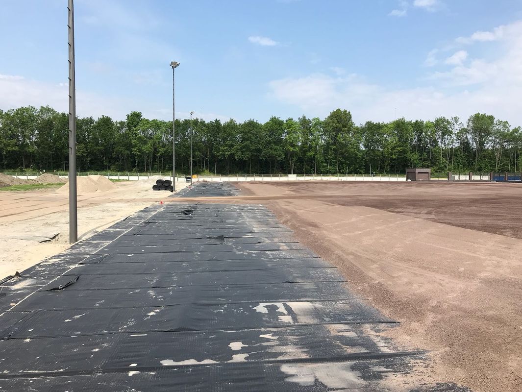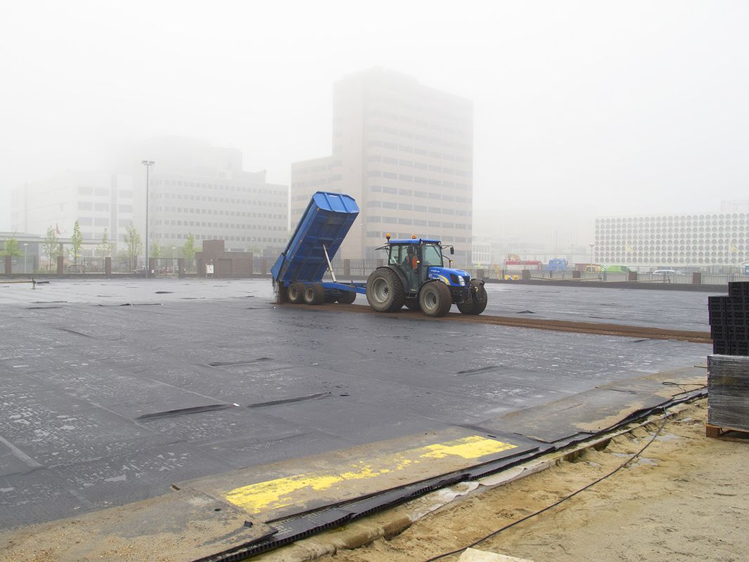 Het ND 900hd Drainagesysteem is inmiddels aangelegd waarna er verder wordt gegaan met Lava 2/8 laag (ca. 150 mm). De oppervlakte van dit project zal ca. 8600 m² bedragen.