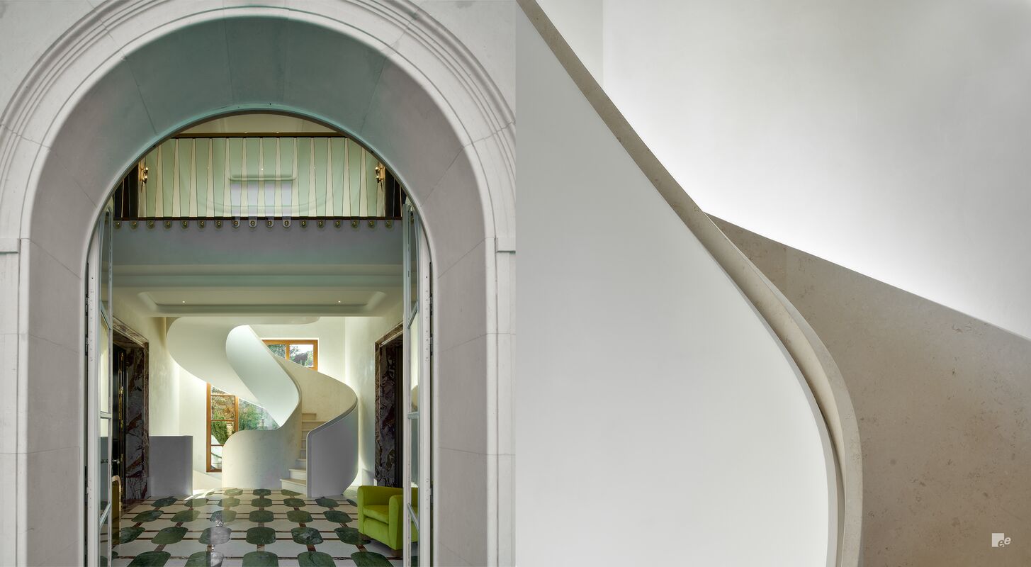 De twee spiraalvormige trappen die EeStairs heeft gemaakt en geïnstalleerd, zijn het eerste wat u ziet als u door de voordeur loopt - en elk deel van de trap lijkt te gloeien met zacht licht. Het perfect gladde trap plafond en de tweelaagse balustrade zijn bedekt met marmer en gepolijst gips - de laatste is een prachtige oppervlaktebehandeling die voor het eerst werd gebruikt in het oude Rome.