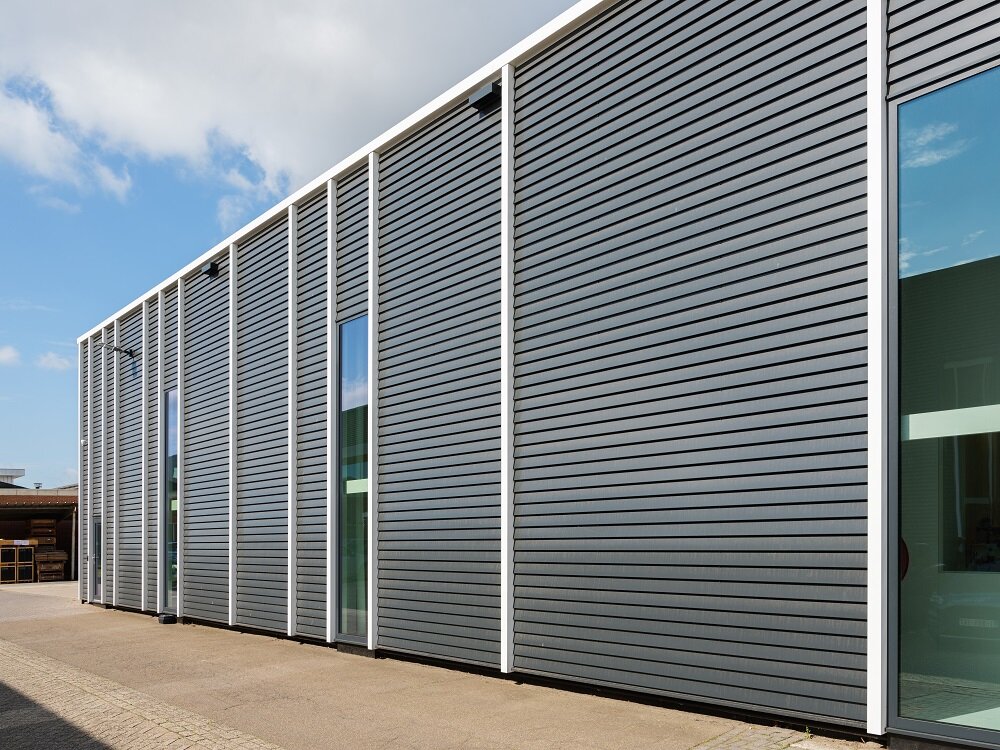 in de kleur Black Grey (RAL 7021). Door de combinatie met witte metalen kaders rond de ramen en als daklijst is een strak ontwerp ontstaan. In totaliteit is er 1.825 m