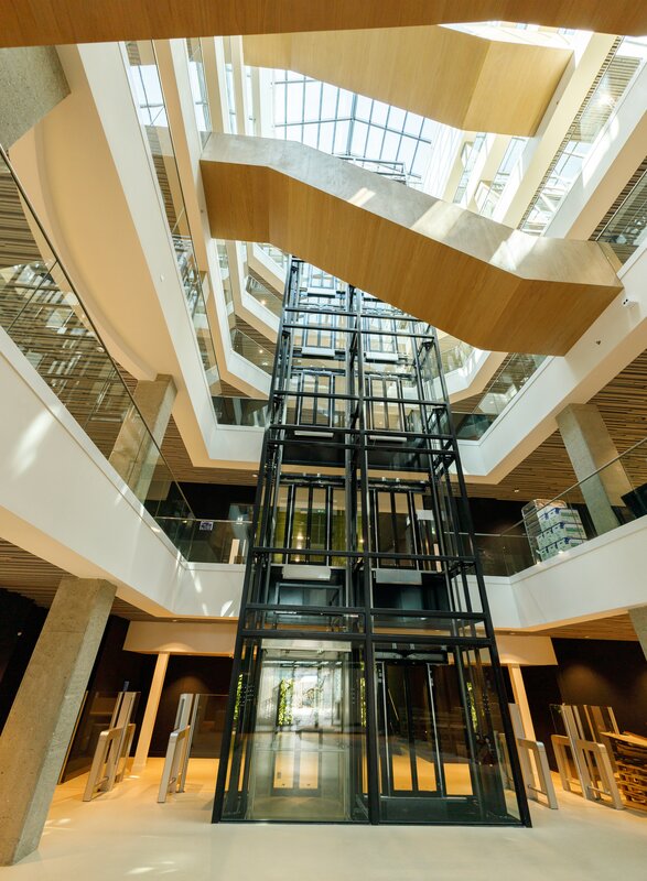 ‘Het onderste deel van de schacht is afgewerkt met glas, vanaf drie-en-een-halve meter is de schacht volledig open. Behoudens de voorzijde uiteraard, wat te maken heeft met de noodzakelijke veiligheidsvoorzieningen. Zowel het opengewerkte als het gedeelte met glas dragen bij aan het open karakter van dit gebouw.’