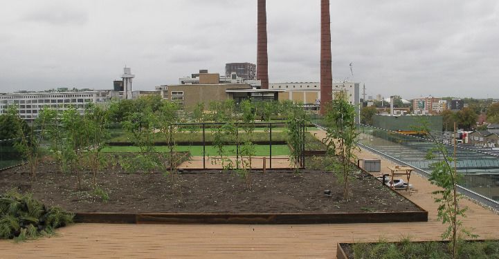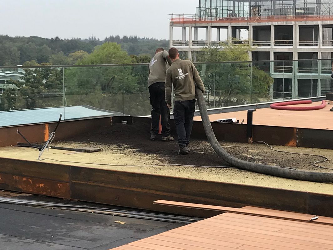 Der Kinderen Hoveniers zal hier in het bijzijn van een van onze adviseurs een Nophadrain Intensief Groendaksysteem van 2200 m² aanleggen. Het ND 4+1h Drainagesysteem, de ND WSM-50 Waterreservoirplaten en het ND DGS-I Substraat Intensief vormen dit intensieve groendaksysteem.