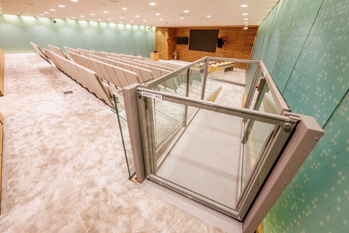 Defesche van den Putte werkte samen met Euroliften het plan uit om een rolstoellift in de zaal te krijgen. ‘De wens was om een rolstoellift te realiseren die rolstoelgebruikers vanaf de eerste verdieping naar het een-meter-twintig lager gelegen podium zou brengen. Een relatief goedkope kolomheffer was vanuit esthetisch oogpunt geen optie. Van het feit dat de kolom boven het vloerniveau zou uitsteken, werd de architect niet blij. Dat is ook volledig te begrijpen, want het zou het super strakke effect van de mooie glazen wand teniet doen. De optie om een schaarlift in te zetten, werd wel met gejuich ontvangen.’