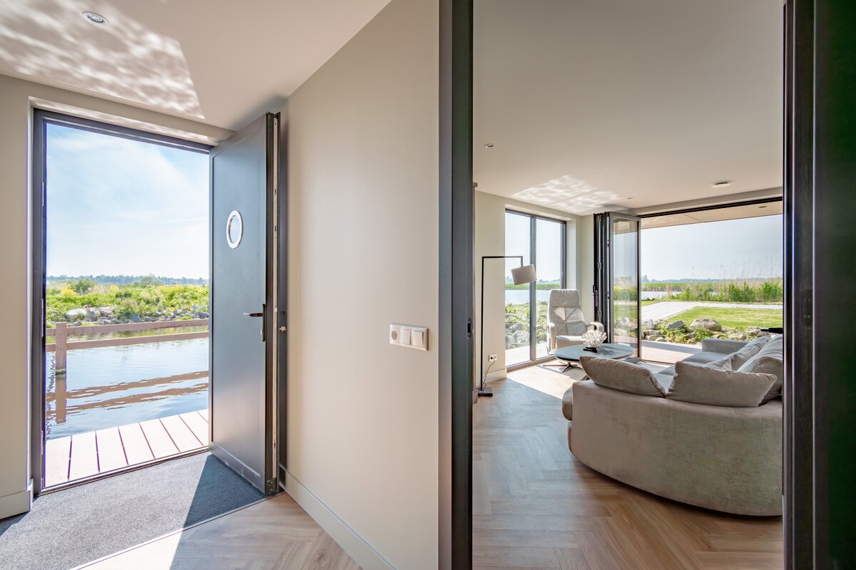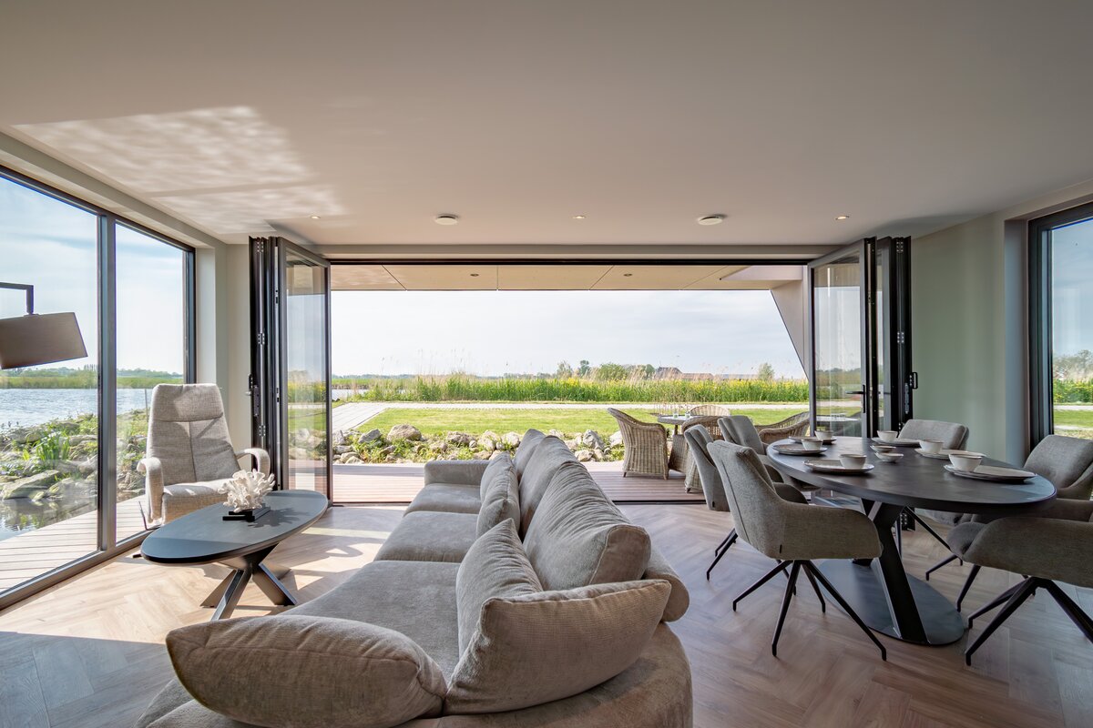 Aan de terraskant van de woningen viel de keuze op de New Panorama van Aliplast. Deze vouwwanden bieden een onbeperkt panoramisch uitzicht op het water. Dit systeem kenmerkt zich door zijn flexibiliteit, met mogelijkheden voor 2 tot 8 vleugels en glasdiktes variërend van 9 tot 50 mm. Deze oplossing heeft een inbouwdiepte van 75 mm voor kader en vleugel en een aanzichtbreedte tussen 15 en 58 mm voor het kader en 73 mm voor de vleugel.