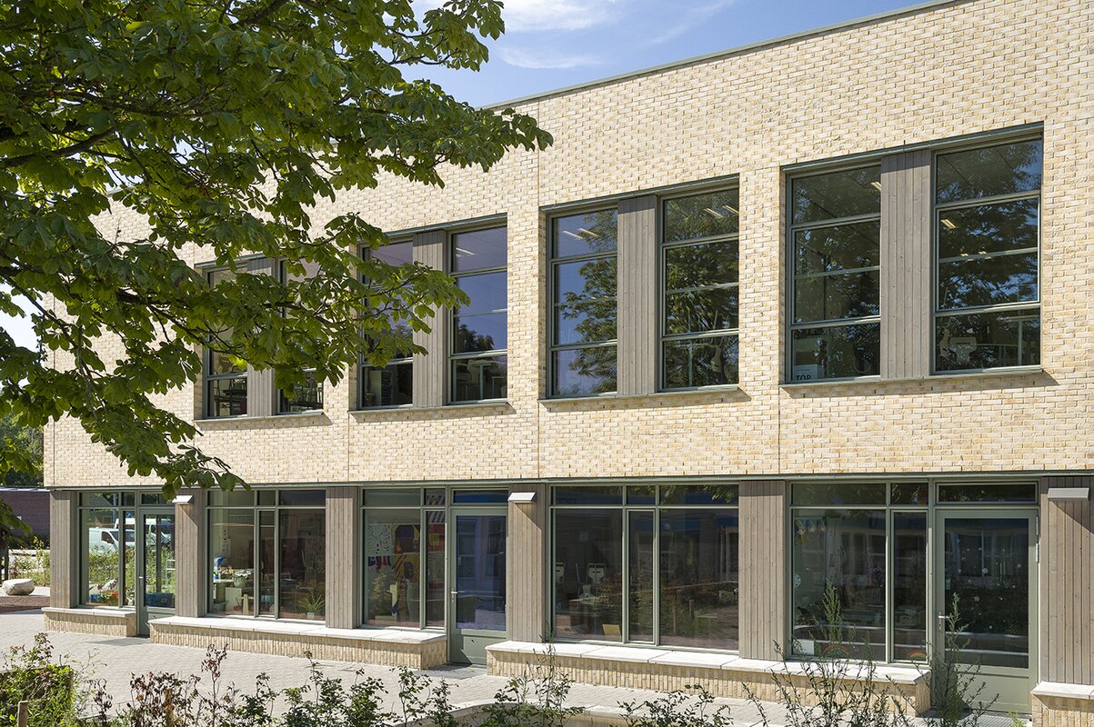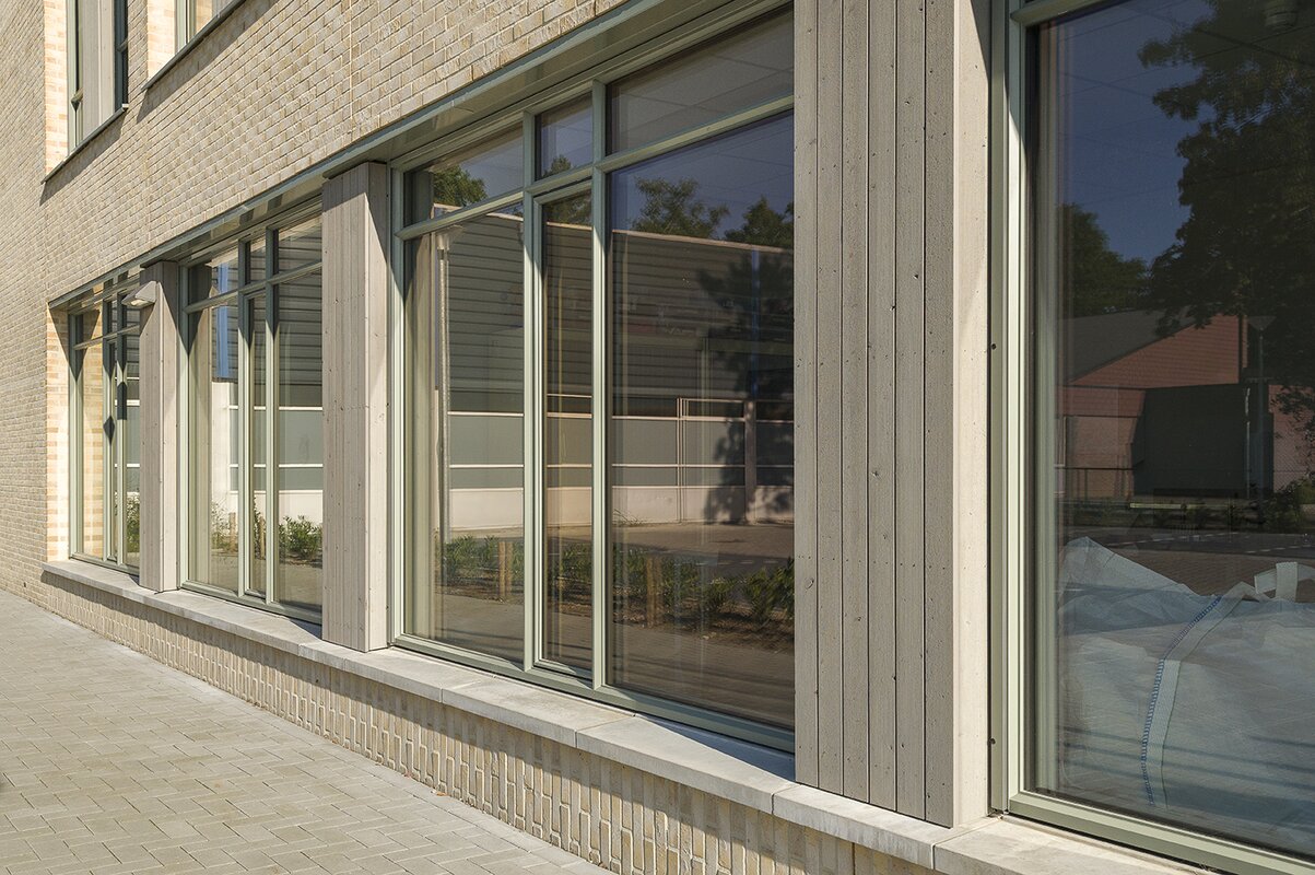 In 2022 benaderde de architect ons voor specifieke raamsystemen zoals hij deze voor ogen had. Dankzij onze verticale integratie konden we snel type Max Light Steel voorstellen als oplossing. Deze reeks combineert de industriële uitstraling van stalen profielen met de voordelen van aluminium: licht, sterk en onderhoudsvriendelijk. “Dankzij de ultraslanke profielen konden grote raampartijen worden gerealiseerd die veel daglicht binnenlaten”, vertelt Marc Mulders, salesmanager bij Aliplast. “Bovendien is aluminium duurzaam en ideaal voor intensief gebruikte omgevingen zoals scholen.”