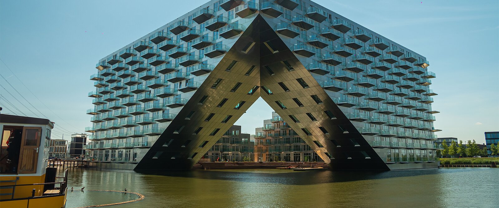 Op de plek waar stad, landelijk gebied en water elkaar ontmoeten in Amsterdam IJburg is Sluishuis gerealiseerd: het karakteristieke woningbouwproject van architectenbureaus Bjarke Ingels Group en Barcode Architects. Voor het glas viel de keuze op Thermobel iplus met een extra isolerende afstandhouder, dubbel en triple uitgevoerd. De karakteristieke over het water uitkragende gevel is voorzien van beloopbaar brandwerend glas Pyrobel EI60.
