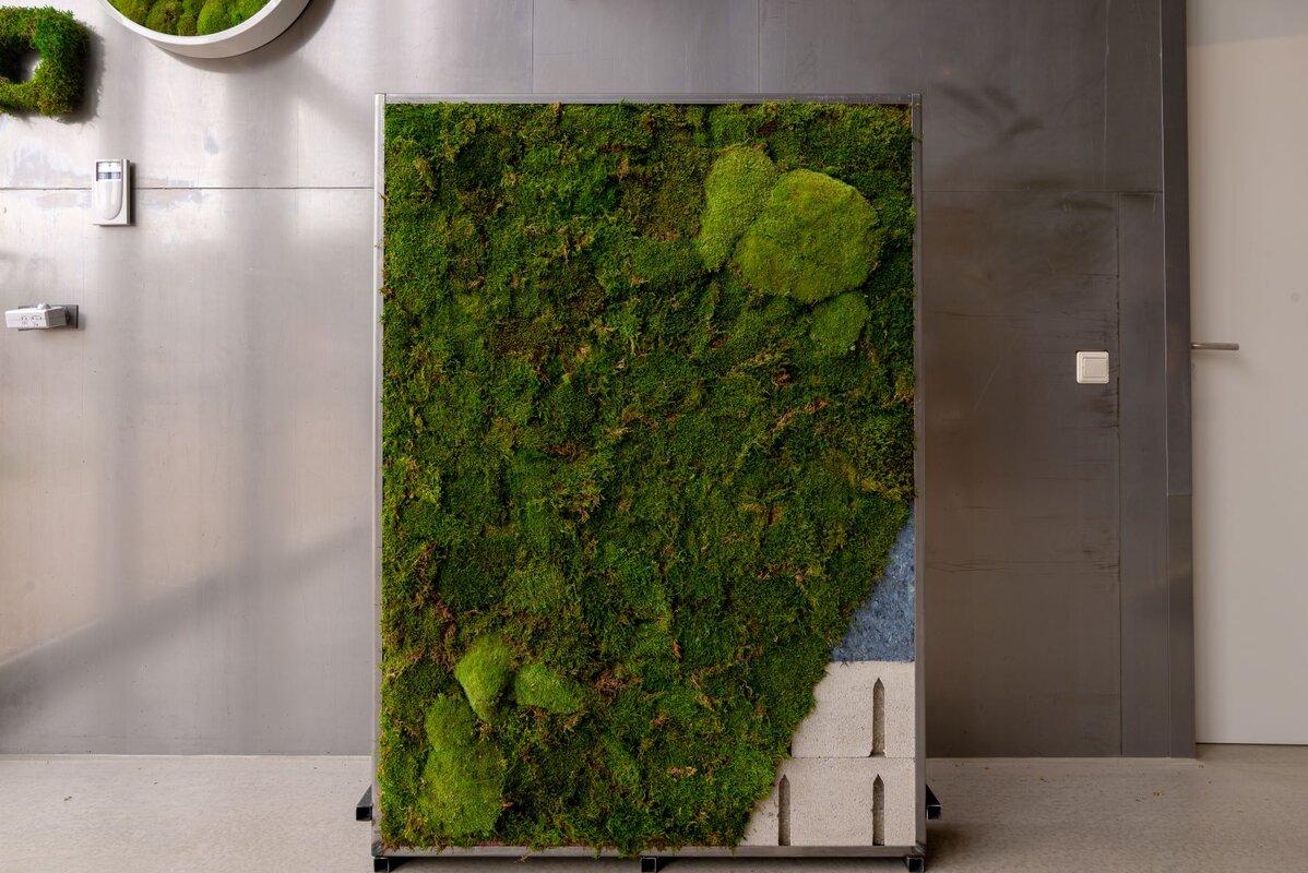 Met deze 100% natuurlijke mos kunnen ook mospanelen gemaakt worden in elke gewenste vorm en afmeting waarmee een geluidsabsorberende wand kan worden gerealiseerd met behulp van een van een backing van organisch materiaal met een hoge geluidsabsorberende prestatie. Deze geeft elke representatieve ruimte een natuurlijke en zeer exclusieve uitstraling.