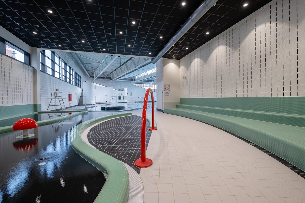 Zo is de ruimteakoestiek in het zwembad ‘Jonfosse ‘in Luik (België) in diverse ruimtes op peil gebracht met Soundblox die een bijdrage vormen in zowel de esthetiek als de akoestiek.