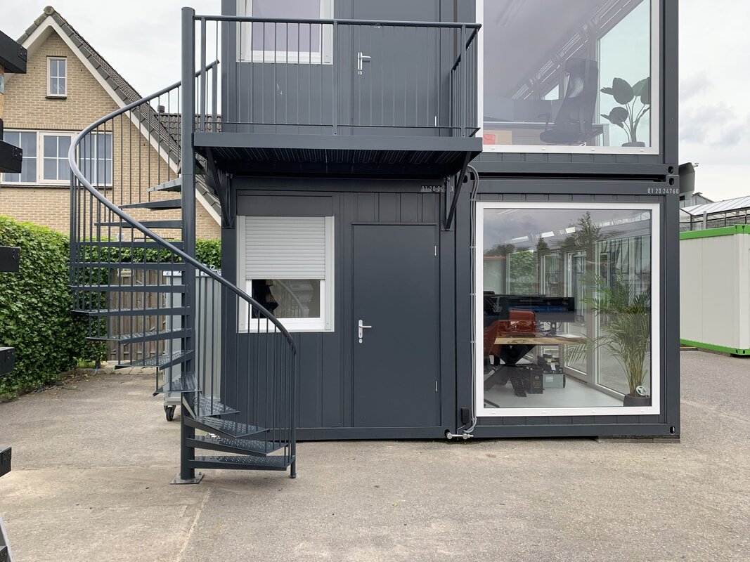 Voor dit soort woon-/werkcontainers ontwikkelden wij een spiltrap met bordes die aansluit op elke standaard container. Het bordes kan los aan de container gehangen worden. Zowel links als rechts is een aansluiting voor een spiltrap. Bij meerdere containers boven elkaar kunnen de spiltrappen op elkaar geklikt worden tot een hoogte van 8 verdiepingen. Door de modulaire opbouw zijn de trappen snel gemonteerd. Ook andere opstellingen zijn mogelijk. De spiltrappen en bordessen zijn thermisch verzinkt en voorzien van 2-laags polyester poedercoating.