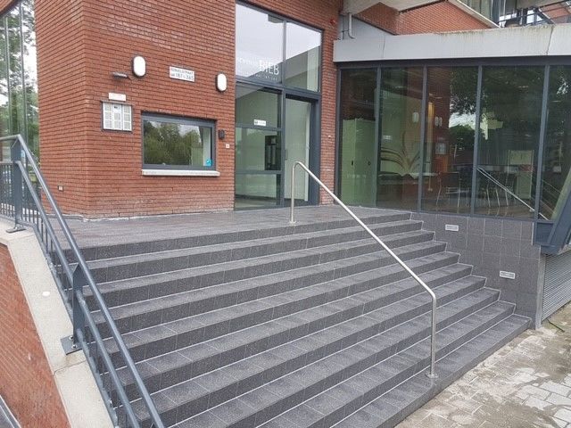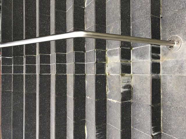 De trap met hellingbaan die een afwerking heeft van keramische tegels kreeg, ondanks dat deze twee jaren geleden op dezelfde wijze volledig hersteld was, dezelfde problemen zoals het loskomen van de keramische tegels en zeer veel uitbloeiingen van vrije kalk.