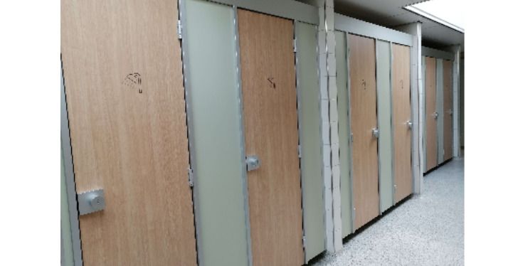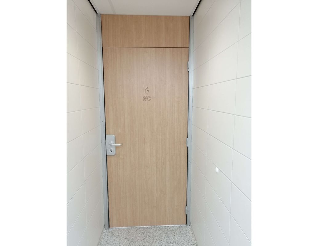Type cronus bestaat uit 13 mm massief HPL met een hoogwaardig afwerkingsniveau. De wanden zijn geleverd in vrijhangende uitvoering. Alle deuren in een speciale houtprint en voorzien van ingefreesde pictogrammen.