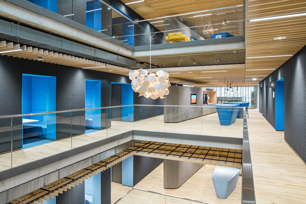 De Vanderlande toren wordt door een plintgebouw van twee lagen en enkele loopbruggen met overige lage bouwwerken op de campus verbonden. In deze plint bevinden zich de facilitaire functies, vergader- en congresfaciliteiten, kantoren van de ondersteunende afdelingen en de directie. Om iedere ruimte naar wens en volgens BREEAM richtlijnen uit te lichten is door TRILUX een specifiek en volledig in-house lichtplan ontwikkeld. Onze lichtplanners stonden hiervoor in nauw overleg met de adviseur, installateur en architect van het nieuwe kantoorpand voor Vanderlande.