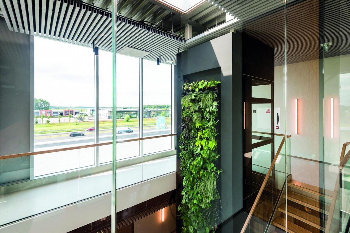 ‘Na het uitbrengen van ons voorstel volgde een periode van veel overleg met Marqant. Dat vond vanwege de coronapandemie voornamelijk via Teams plaats, maar heeft het eindresultaat niet negatief beïnvloed. Afgelopen maart is de lift opgeleverd. De opdrachtgever is content met de lift die drie stopplaatsen kent, gepoedercoat is in RAL 9005 -prachtig matzwart- en gedeeltelijk in glas is uitgevoerd. En wij ook! Dat heeft ook te maken met de mooie combinatie met de aangebrachte groenwand. Beide elementen zijn energiezuinig en duurzaam. Wederom een prachtig project om aan bij te dragen!’