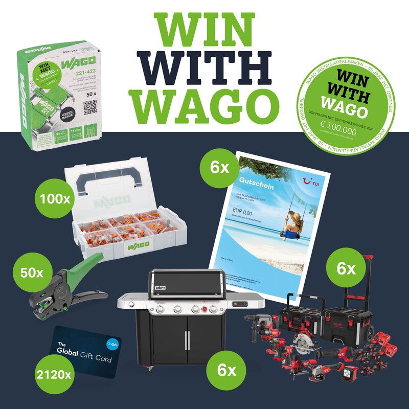 "Win with WAGO" is een unieke actie voor de elektroprofessional, waarbij gebruik wordt gemaakt van de populaire WAGO-series 221 en 2273. De doosjes van de fast movers in deze series zijn voorzien van een actiesticker met een unieke actiecode, Hiermee maak je kans om verschillende prijzen te winnen. Deze speciale actie organiseren wij vanwege het 50-jarig jubileum van onze lasklemmen.