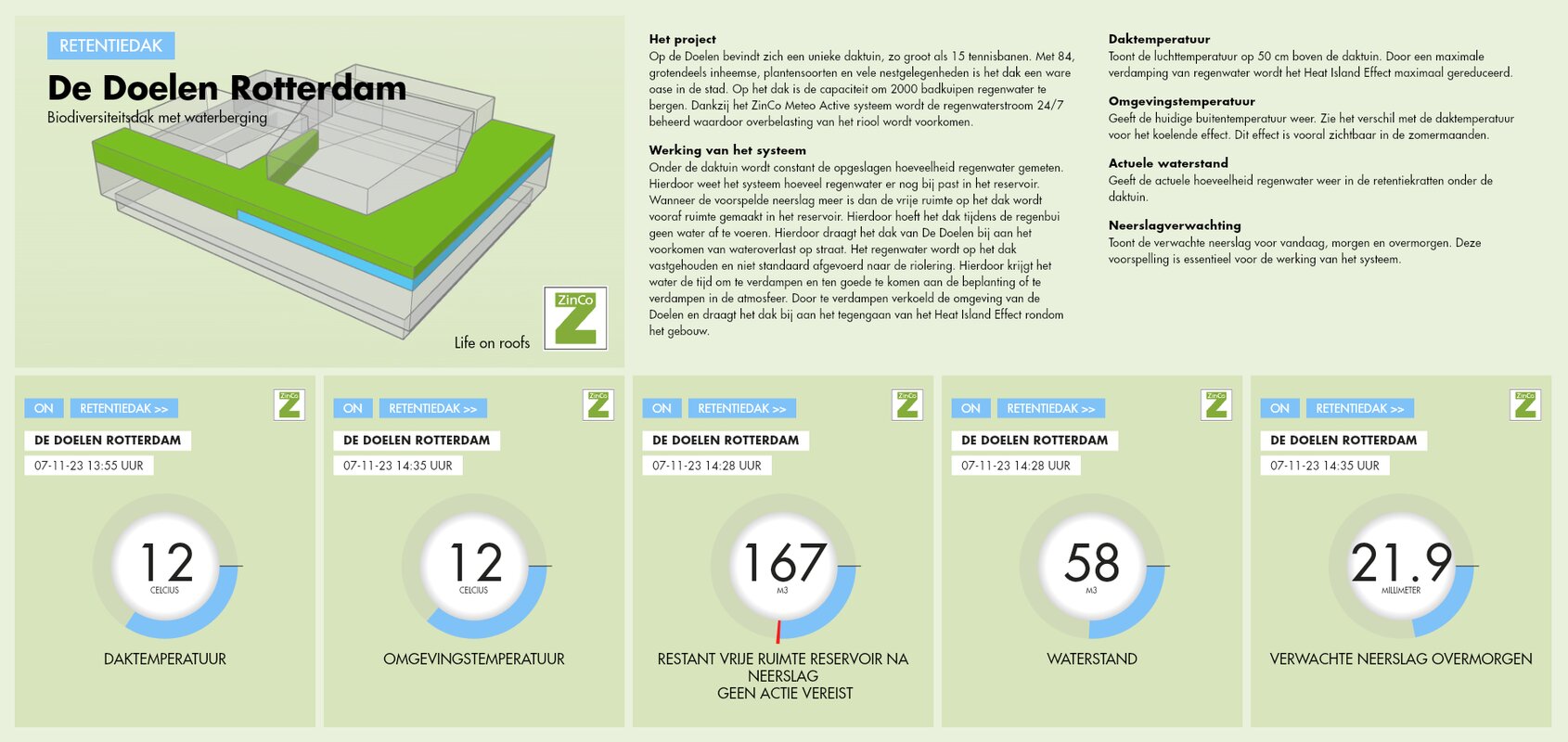 De app ontvangt via sensoren bijvoorbeeld de realtime waterstand op het dak, hoeveel water er met bakken uit de hemel gaat vallen en wat voor hete zomerdag er voor de deur staat. Op basis van deze gegevens voert het systeem opdrachten uit, geprioriteerd en afgestemd op het project om optimale prestaties van het klimaatdak te garanderen. Uiteenlopende opdrachten kunnen worden uitgevoerd, zoals het irrigeren van de beplanting, de tank voor toiletspoeling vullen of voldoende bergingsvolume vrij maken voor toekomstige regenval.